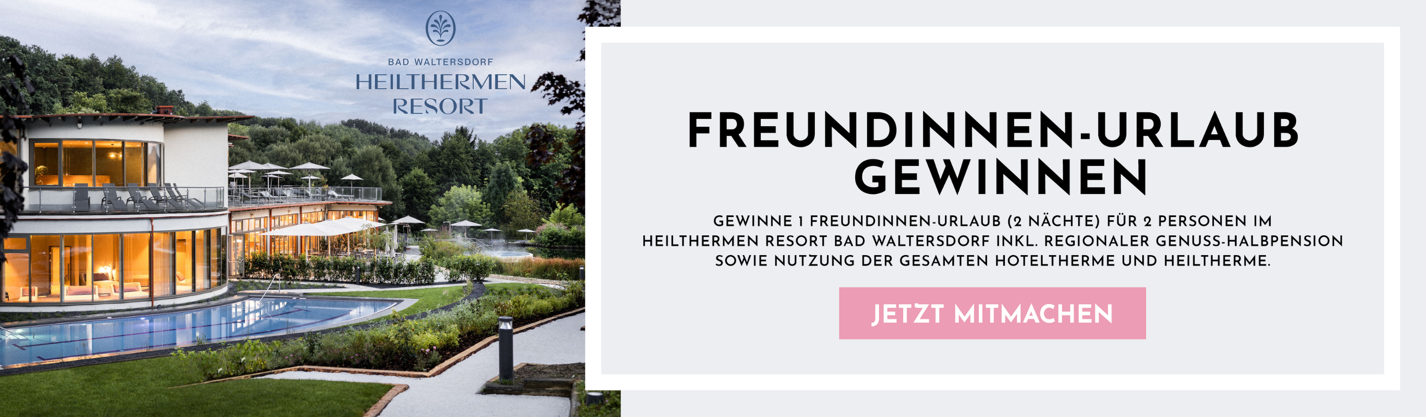Gewinne 1 Freundinnen-Urlaub (2 Nächte) für 2 Personen im Heilthermen Resort Bad Waltersdorf inkl. regionaler Genuss-Halbpension sowie Nutzung der gesamten Hoteltherme und Heiltherme.