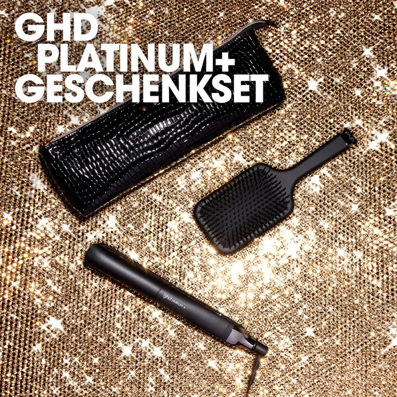 ghd platinum+ Geschenkset. Bring Glamour in die festliche Saison und genieße verführerische und zeitlose good hair days mit dem ghd platinum+ Geschenkset. Der ghd platinum+ professional smart Styler kommt zusammen mit einer ghd the all-rounder - paddle brush und einer Hitzeschutz-Tasche.¹