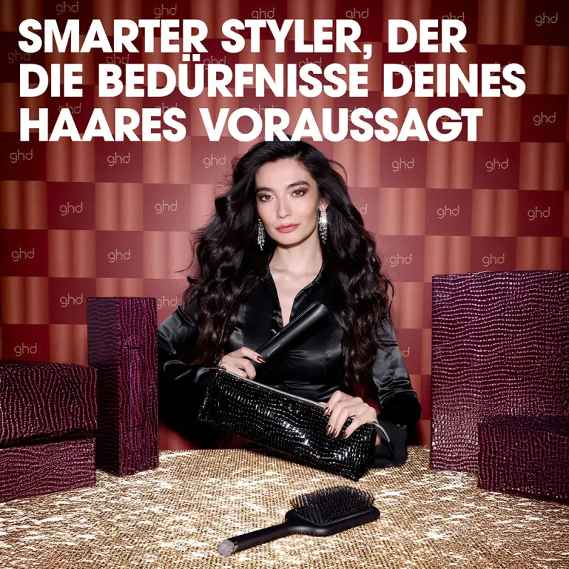 *Das Hitzeschutz-Etui ist nur für die Verwendung mit ghd Produkten geeignet. **Reduziert Haarbruch und liefert 2x mehr Farbbeständigkeit im Vergleich zu einem Styler bei 230 °C. ***Technischer Test im Labor an braunem Haar. Gemessen im Vergleich zu luftgetrocknetem Haar.