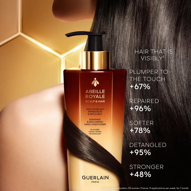 In der entwirrenden, reparierenden & aufpolsternden Pflegespülung ist die reparierende Kraft von 4 Honigsorten kombiniert, die von der GUERLAIN-Forschung wegen ihrer doppelten Wirkung auf Kopfhaut und Haare ausgewählt wurden. Schon ab der ersten Anwendung ist die Kopfhaut ohne fettenden Effekt gut durchfeuchtet, die Haare glänzen und die Faser ist aufgepolstert. Mit jedem Tag wirkt die Faser sichtbar dicker. Die frische milchige Textur, die GUERLAINS Kunst der Formulierung zu verdanken ist, besteht zu 95% aus Inhaltsstoffen natürlichen Ursprungs¹.